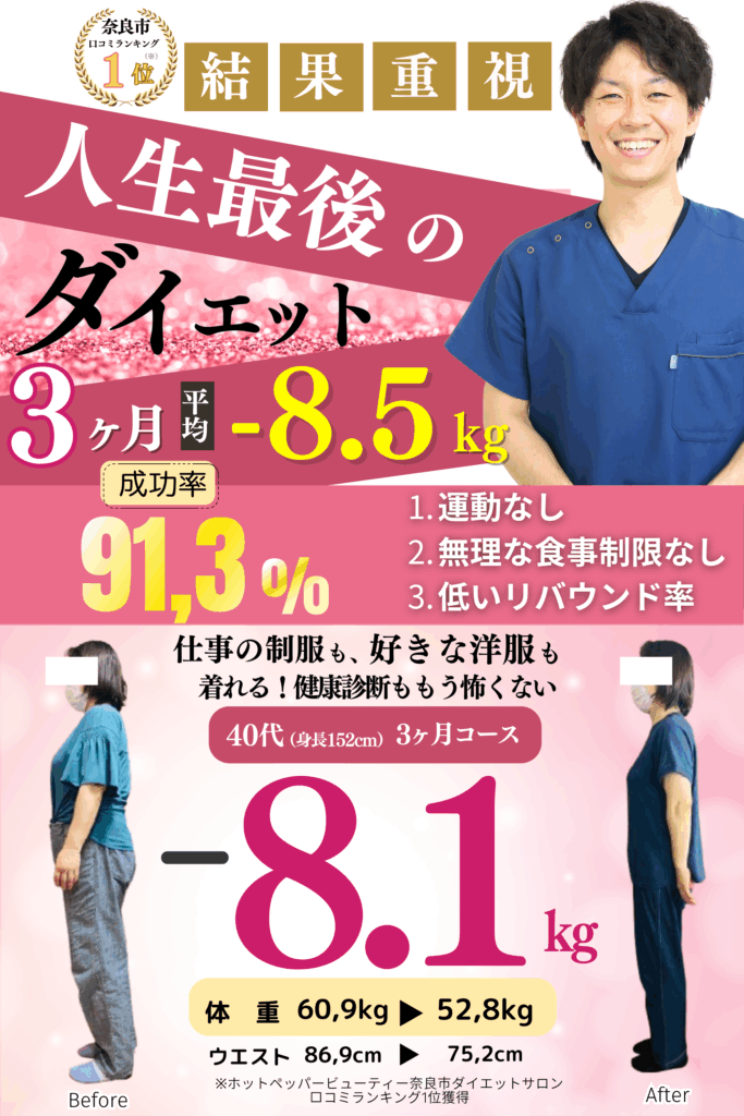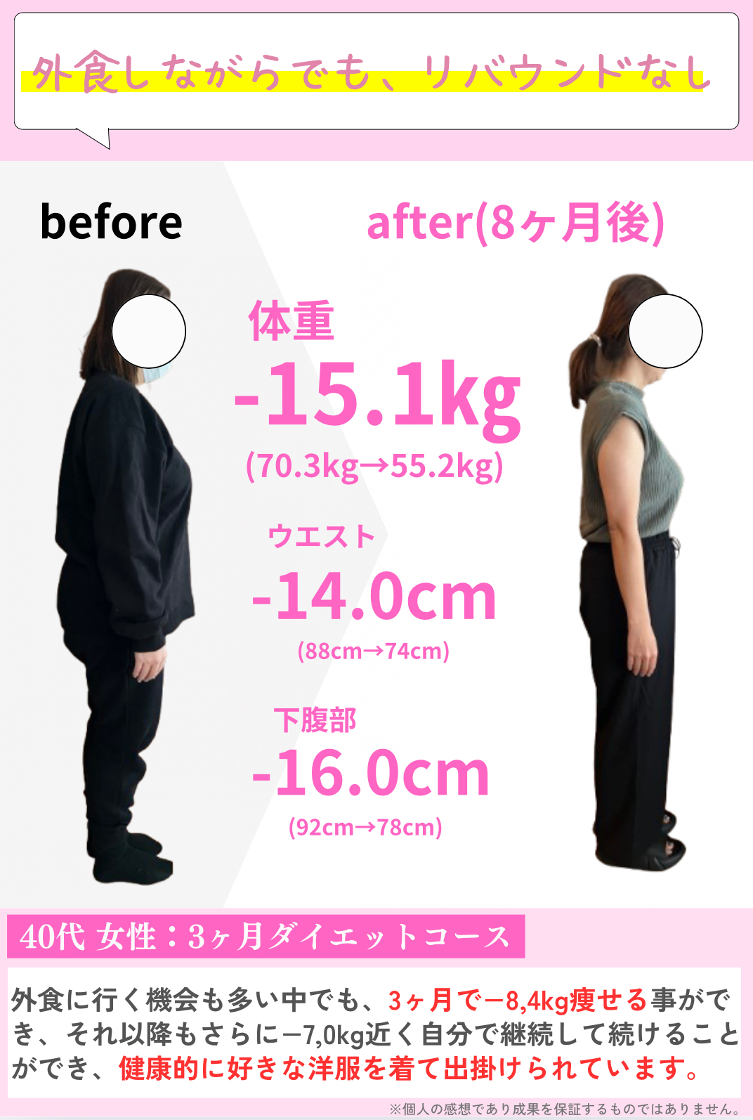 一般的なジムやエステなどは『通院中やコース期間にいかに痩せられるか?』だけを念頭に置いてるから、期間が終了したあとは、途端に痩せなくなり、逆にリバウンドが起こってしまったりするのです。