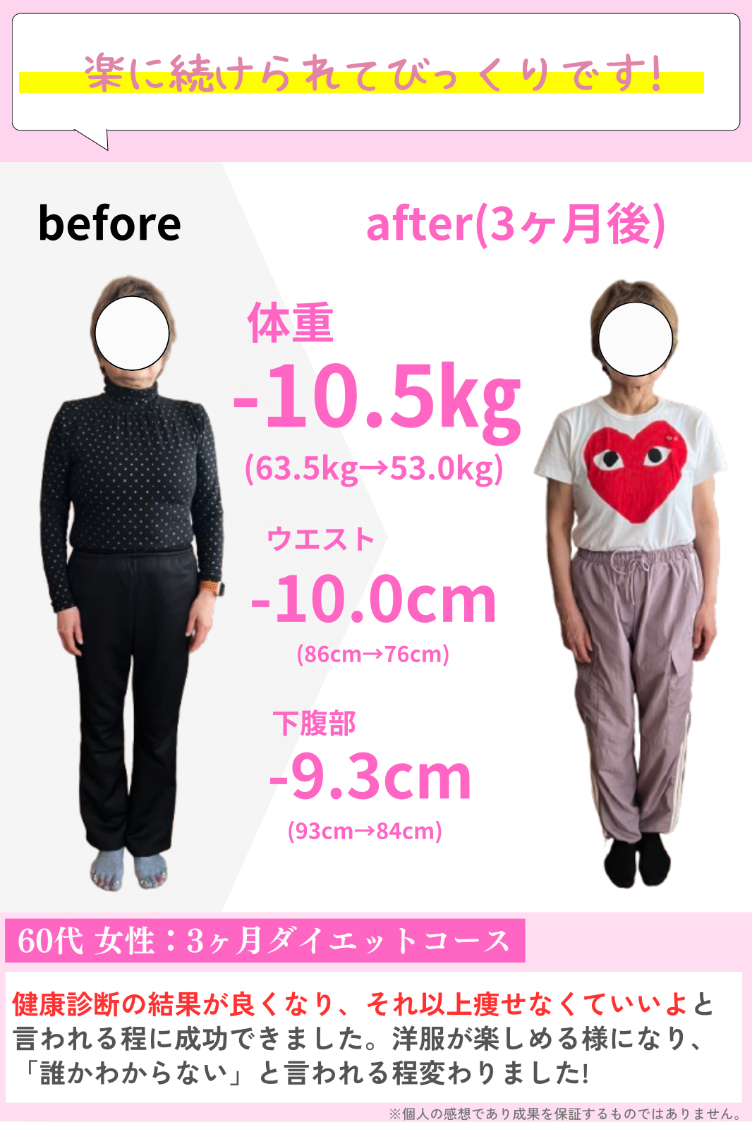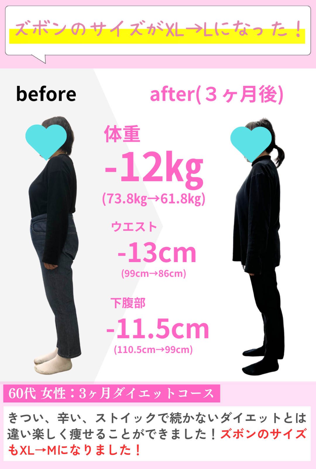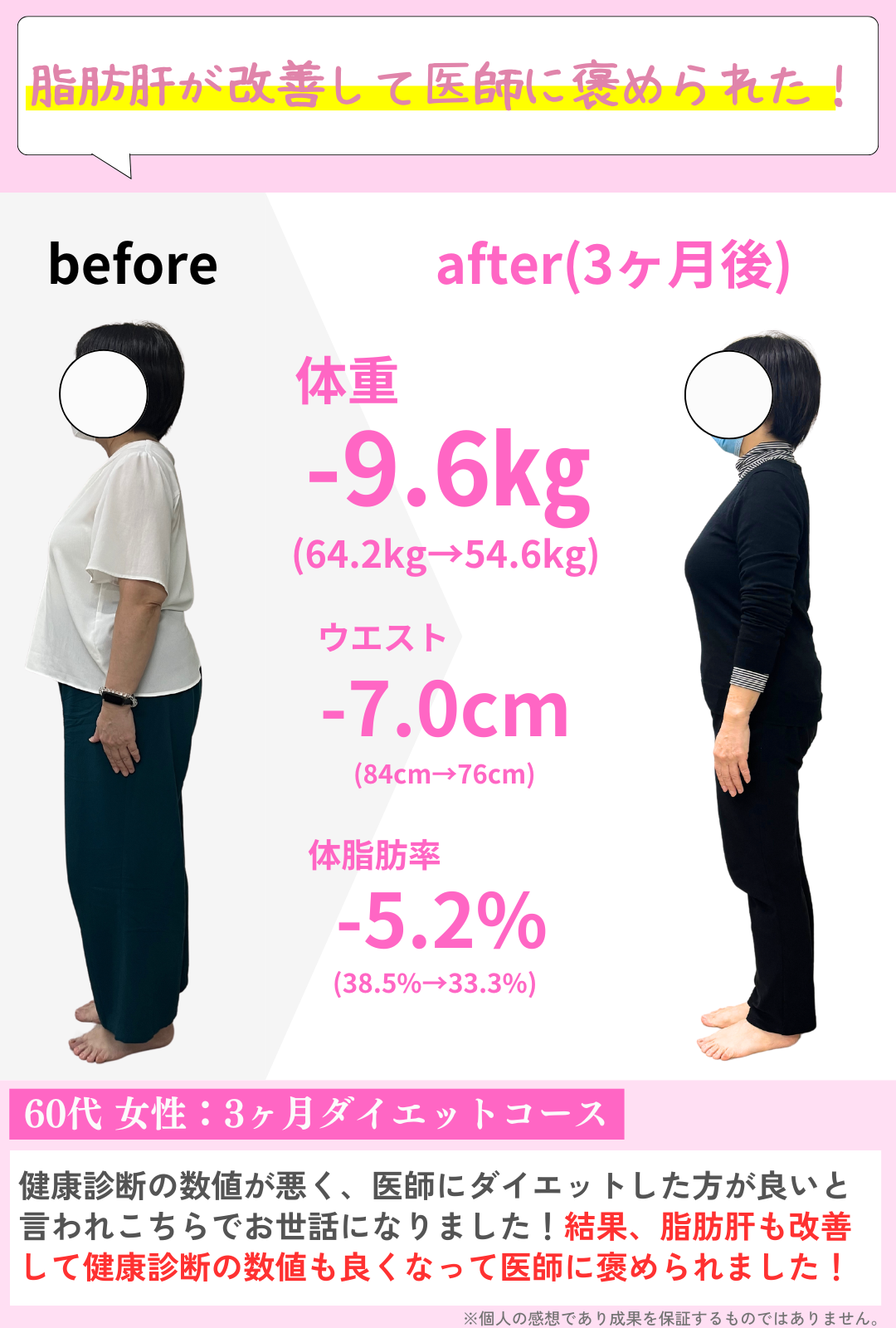 健康診断の数値が悪く、医師に 「痩せなさい」と言われ続けたお客様。 ダイエットは病気の予防に繋がります!