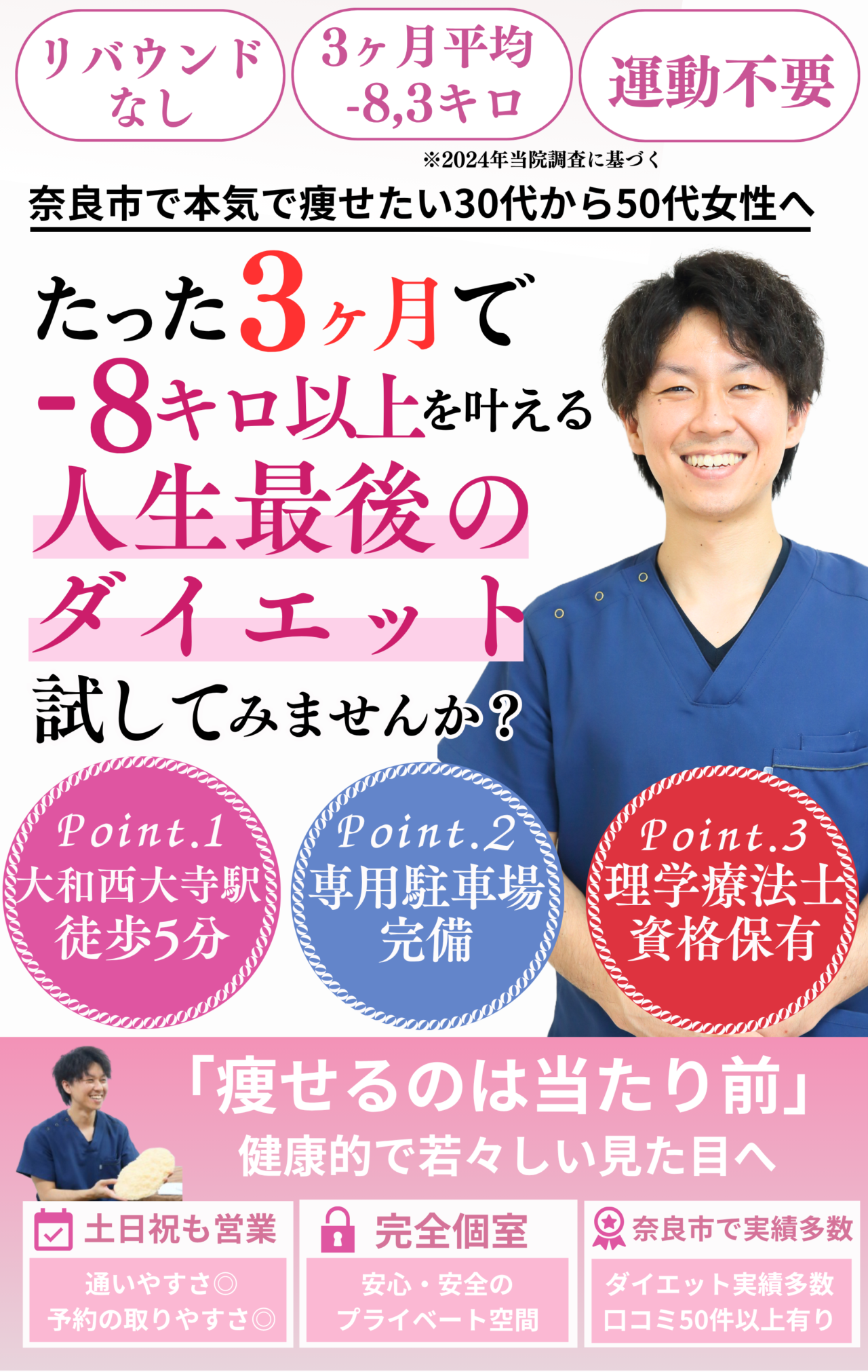 初回のカウンセリングなどを踏まえダイエット計画をお話させていただき、ご納得いただいてからダイエットコースの施術を行なっていきます!当院の人生最後のダイエットコースを「ぜひやってみたい!」思っていただいた方のみのご案内となりますので、安心してお気軽にお越しください。